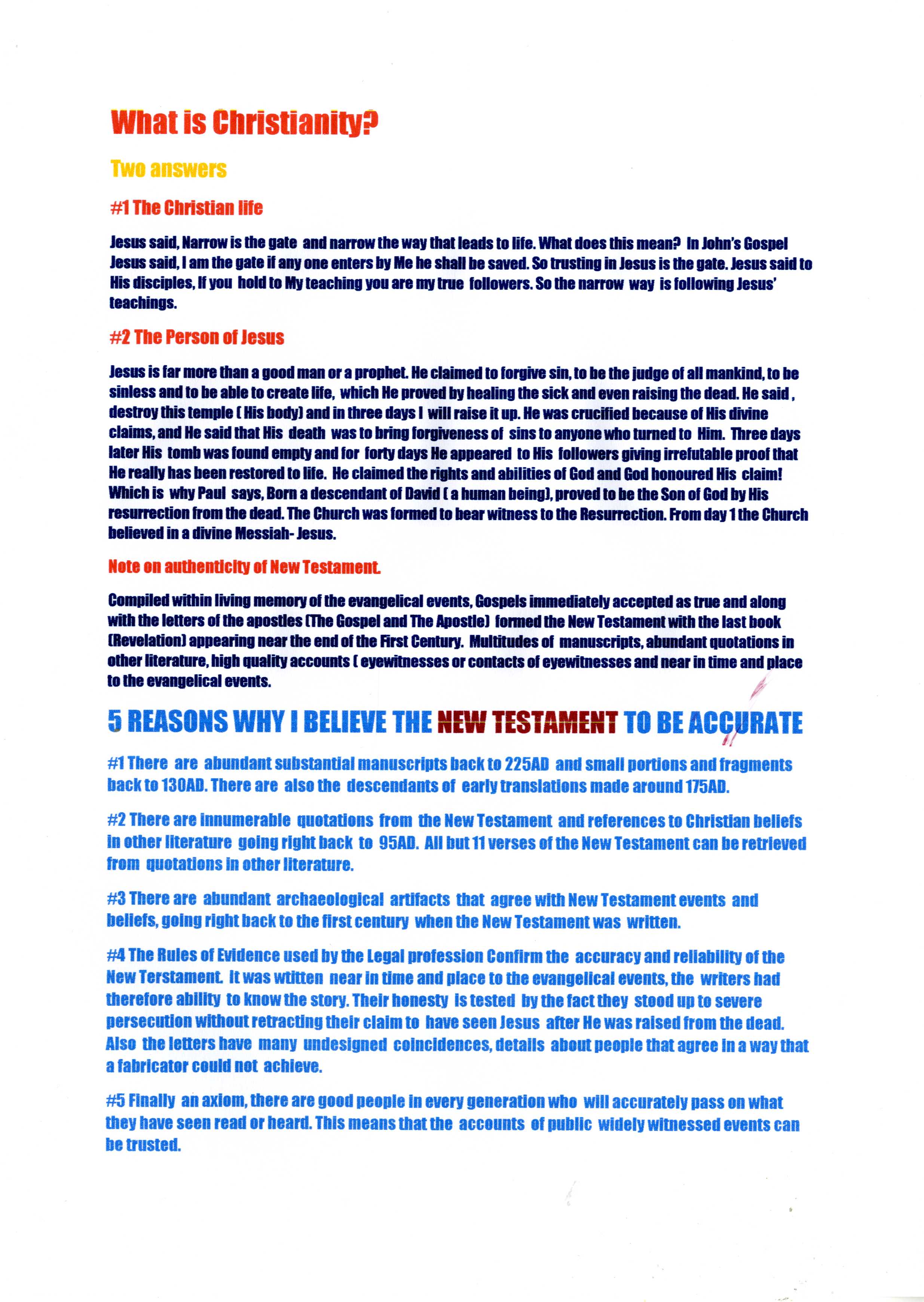 Evidence is presented here that the Bible is true and a reliable document and therefore Christianity is true. Evidence can be collected from observations in Science History and Experience. The most important area is History because the Bible claims that God has revealed Himself in History in the Person of Jesus.